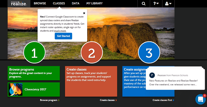 To create classes and to add students. Click on create classes. You can create classes in Pearson realize or connect it to google classroom. You can give any name to your class. The class gives students access to their own accounts.